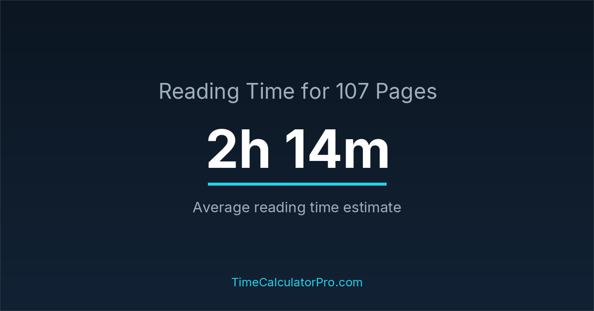 If you read at an average speed of 200 words per minute, reading 107 pages will take approximately 2 hours and 14 minutes. This estimate assumes around 250 words per page, which is typical for most books.