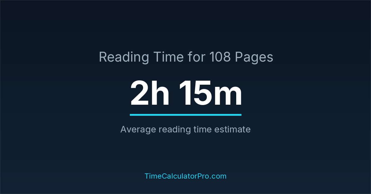 If you read at an average speed of 200 words per minute, reading 108 pages will take approximately 2 hours and 15 minutes. This estimate assumes around 250 words per page, which is typical for most books.
