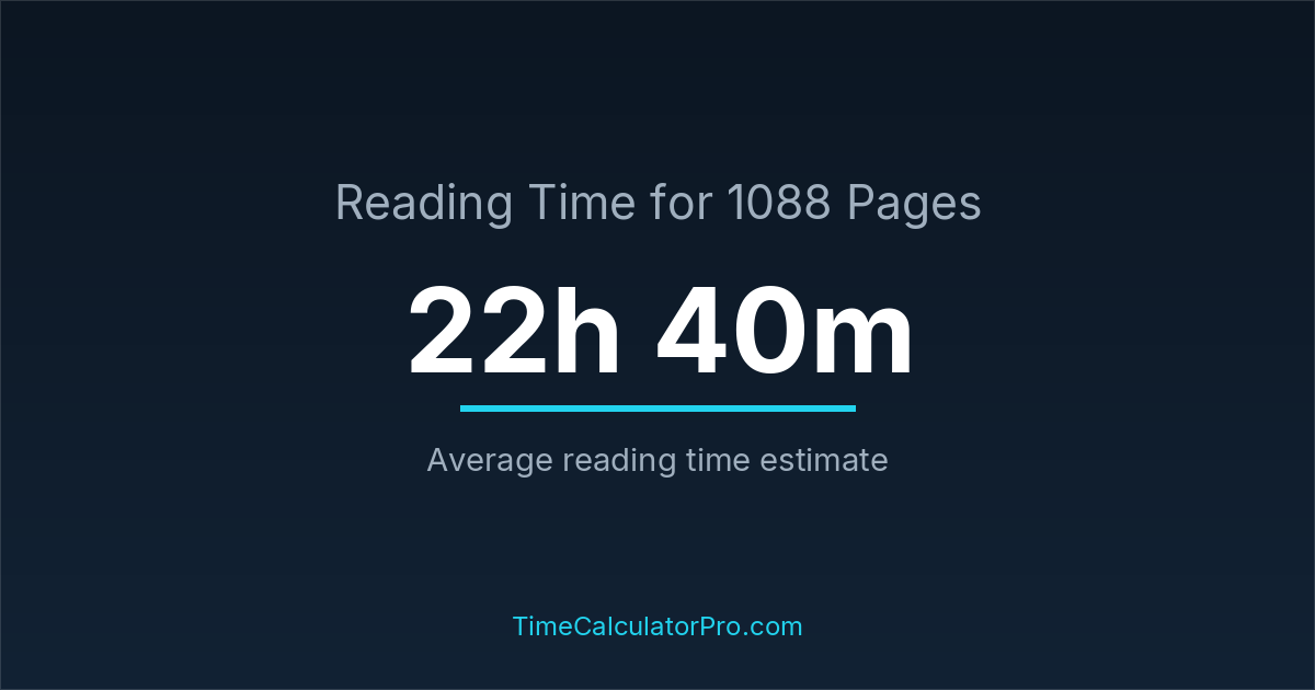 If you read at an average speed of 200 words per minute, reading 1088 pages will take approximately 22 hours and 40 minutes. This estimate assumes around 250 words per page, which is typical for most books.