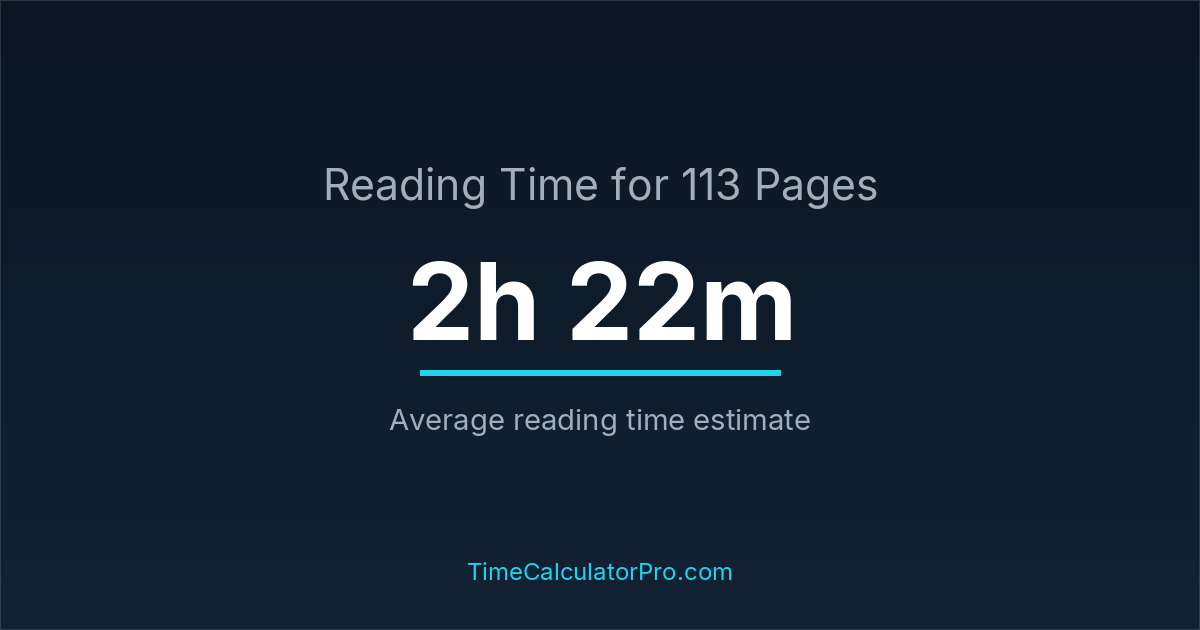 If you read at an average speed of 200 words per minute, reading 113 pages will take approximately 2 hours and 22 minutes. This estimate assumes around 250 words per page, which is typical for most books.