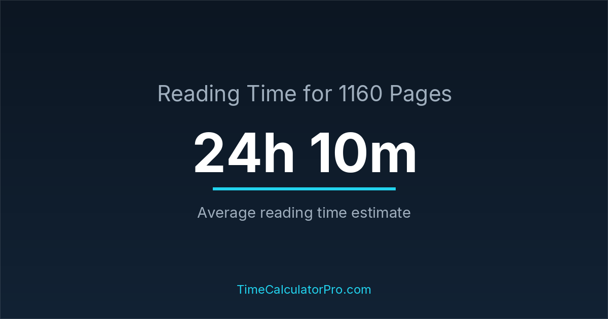 If you read at an average speed of 200 words per minute, reading 1160 pages will take approximately 24 hours and 10 minutes. This estimate assumes around 250 words per page, which is typical for most books.