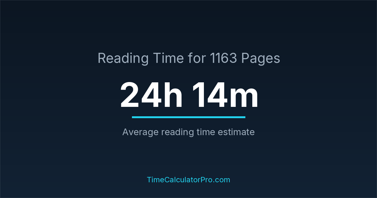 If you read at an average speed of 200 words per minute, reading 1163 pages will take approximately 24 hours and 14 minutes. This estimate assumes around 250 words per page, which is typical for most books.