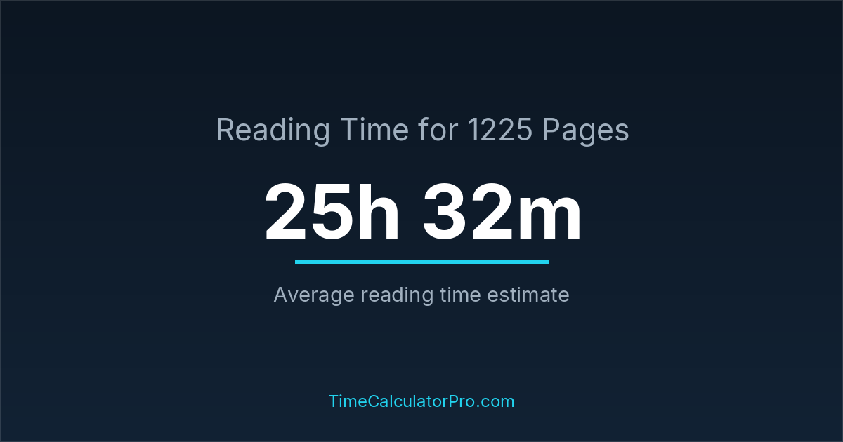 If you read at an average speed of 200 words per minute, reading 1225 pages will take approximately 25 hours and 32 minutes. This estimate assumes around 250 words per page, which is typical for most books.