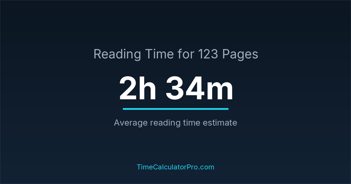 If you read at an average speed of 200 words per minute, reading 123 pages will take approximately 2 hours and 34 minutes. This estimate assumes around 250 words per page, which is typical for most books.