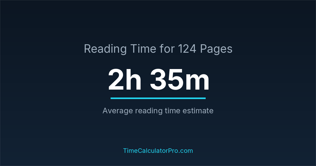 If you read at an average speed of 200 words per minute, reading 124 pages will take approximately 2 hours and 35 minutes. This estimate assumes around 250 words per page, which is typical for most books.