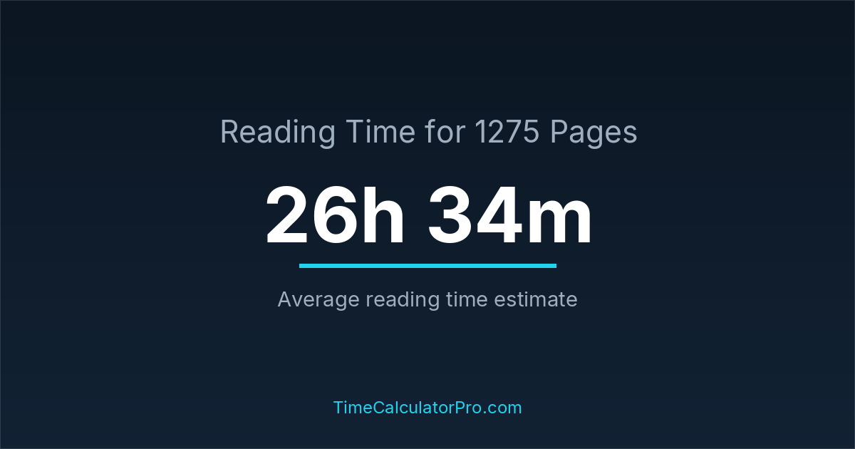 If you read at an average speed of 200 words per minute, reading 1275 pages will take approximately 26 hours and 34 minutes. This estimate assumes around 250 words per page, which is typical for most books.