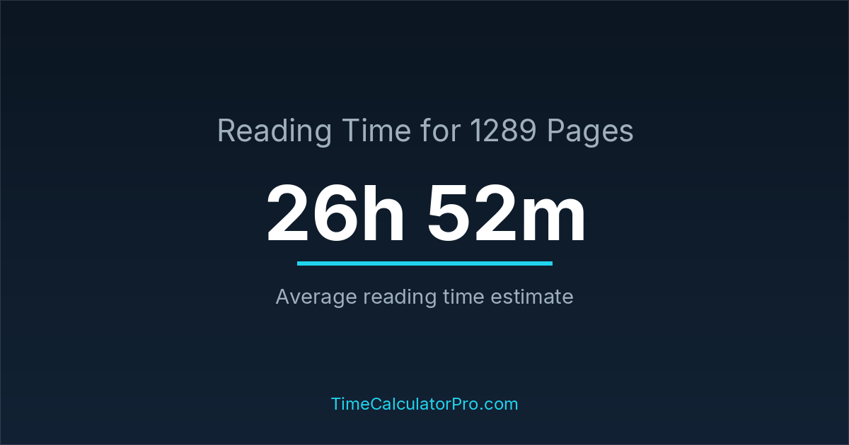 If you read at an average speed of 200 words per minute, reading 1289 pages will take approximately 26 hours and 52 minutes. This estimate assumes around 250 words per page, which is typical for most books.
