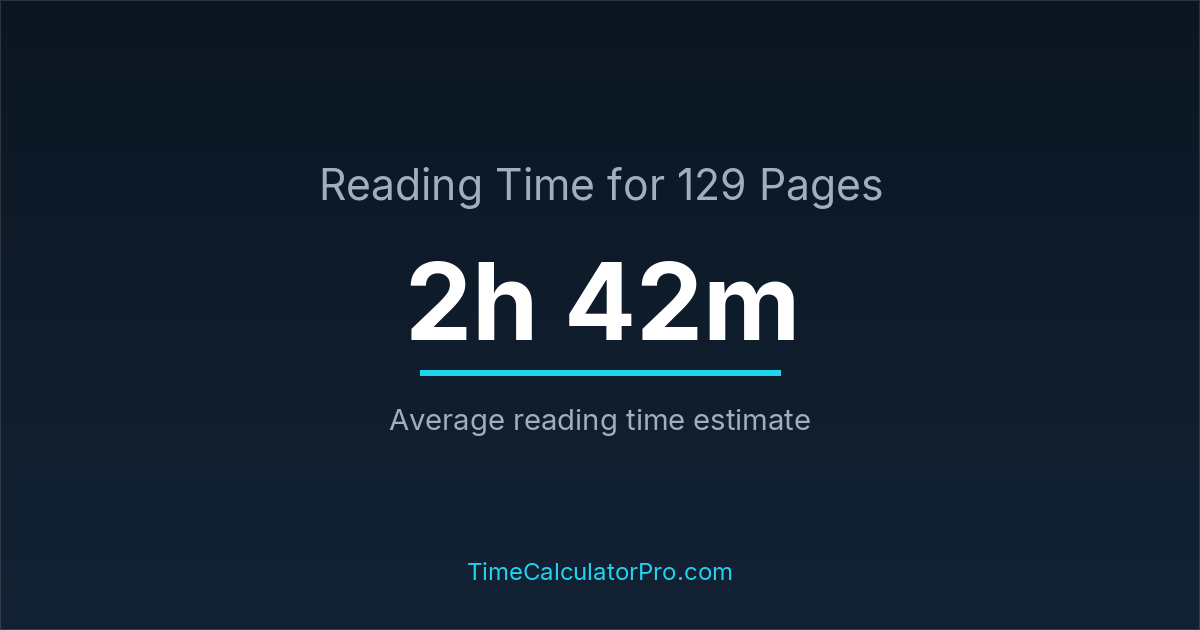 Reading 129 pages usually takes approximately 2 hours and 42 minutes for the average reader, though this can vary depending on concentration and reading habits.