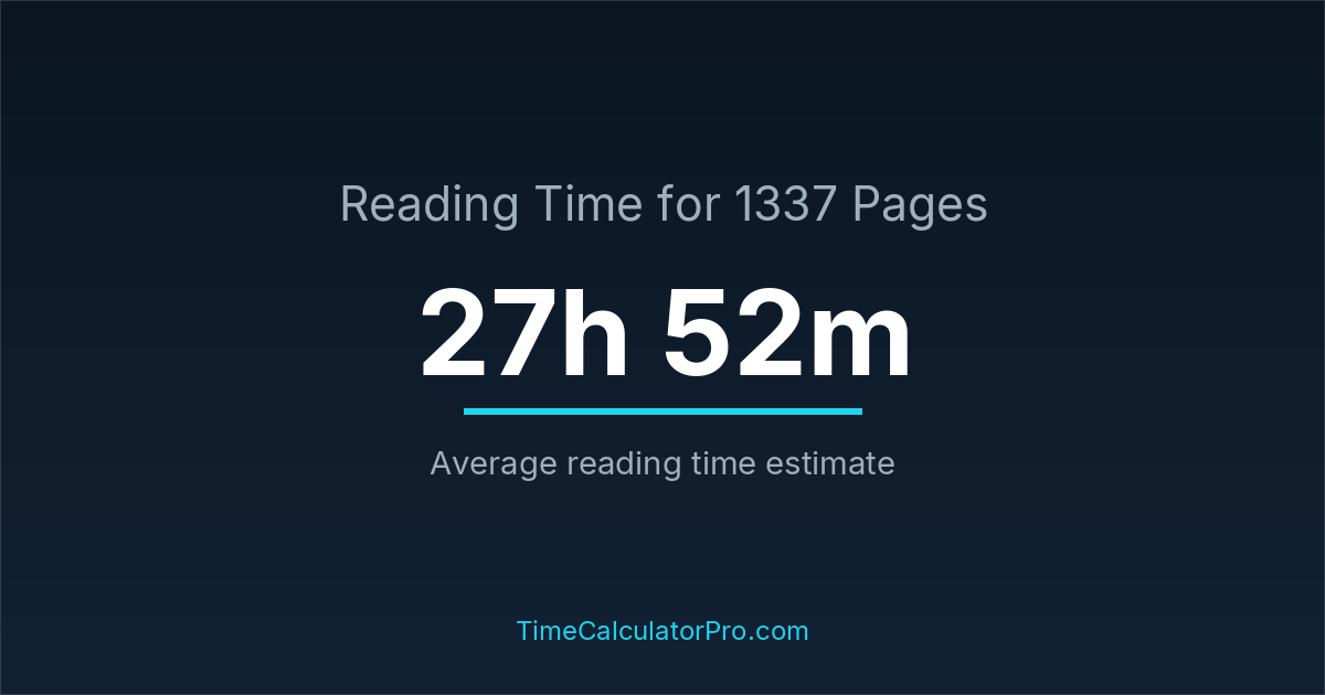 If you read at an average speed of 200 words per minute, reading 1337 pages will take approximately 27 hours and 52 minutes. This estimate assumes around 250 words per page, which is typical for most books.