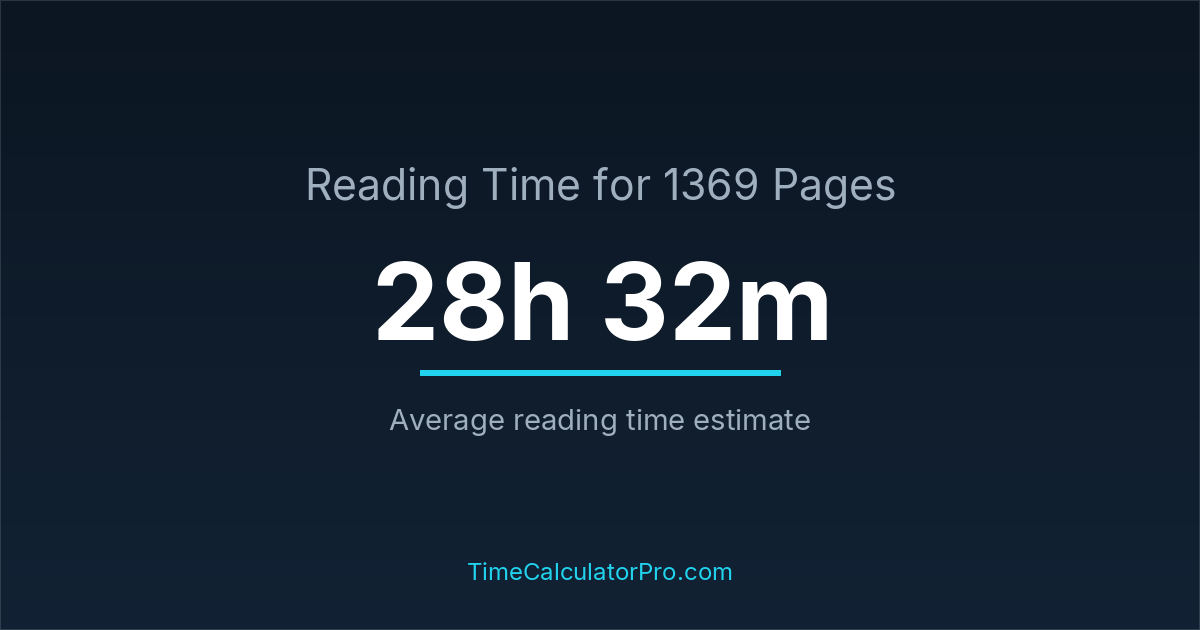 If you read at an average speed of 200 words per minute, reading 1369 pages will take approximately 28 hours and 32 minutes. This estimate assumes around 250 words per page, which is typical for most books.