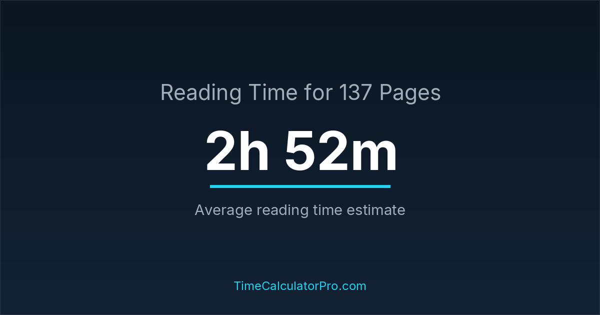 If you read at an average speed of 200 words per minute, reading 137 pages will take approximately 2 hours and 52 minutes. This estimate assumes around 250 words per page, which is typical for most books.