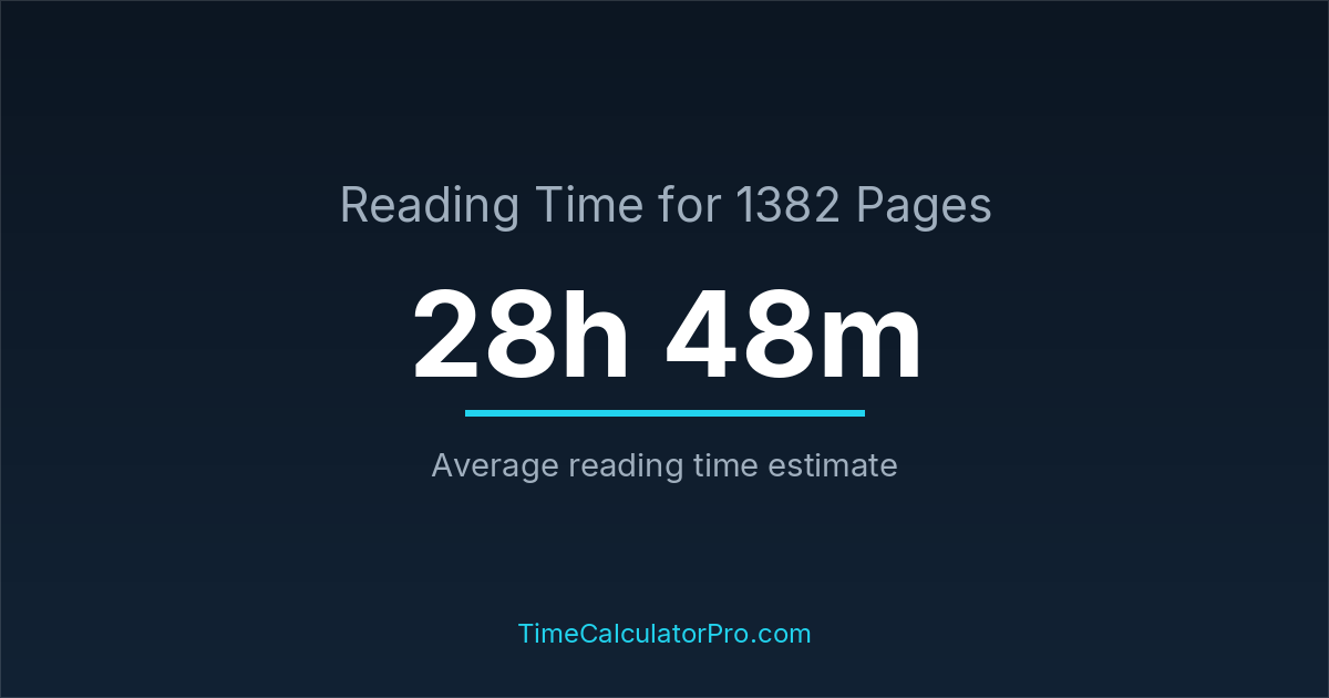 Reading 1382 pages usually takes approximately 28 hours and 48 minutes for the average reader, though this can vary depending on concentration and reading habits.