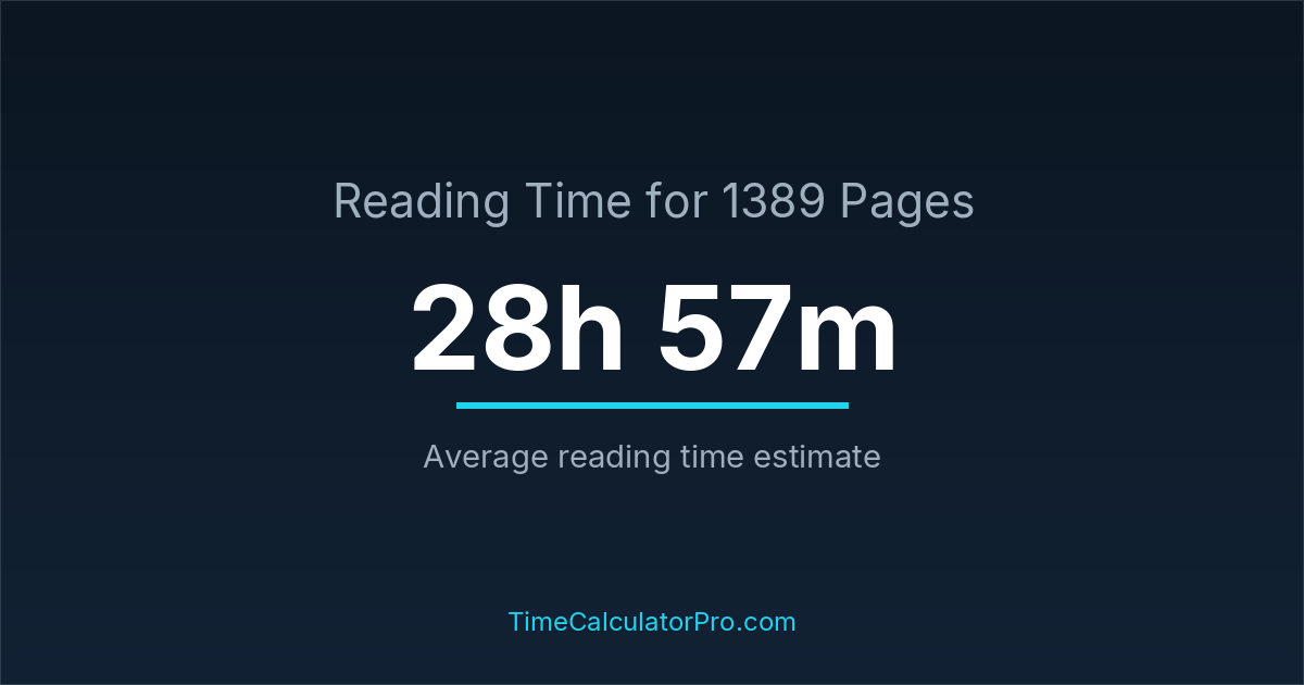 If you read at an average speed of 200 words per minute, reading 1389 pages will take approximately 28 hours and 57 minutes. This estimate assumes around 250 words per page, which is typical for most books.