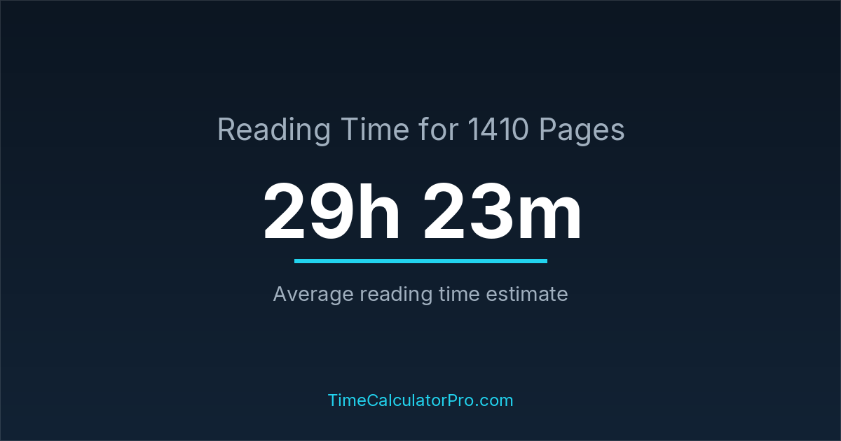 If you read at an average speed of 200 words per minute, reading 1410 pages will take approximately 29 hours and 23 minutes. This estimate assumes around 250 words per page, which is typical for most books.