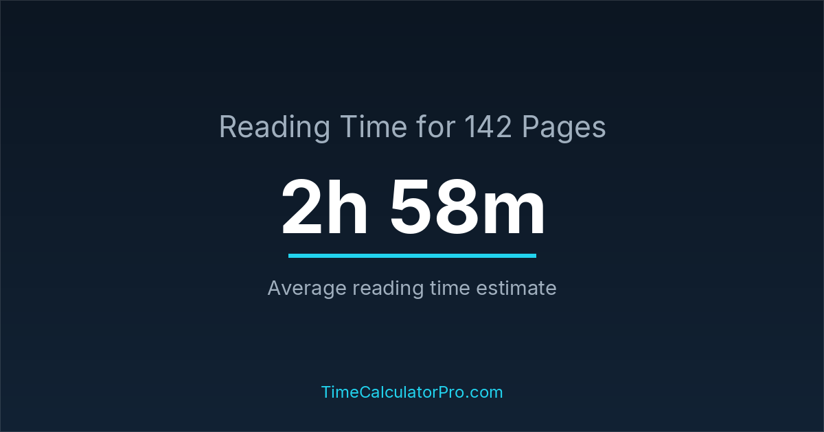If you read at an average speed of 200 words per minute, reading 142 pages will take approximately 2 hours and 58 minutes. This estimate assumes around 250 words per page, which is typical for most books.