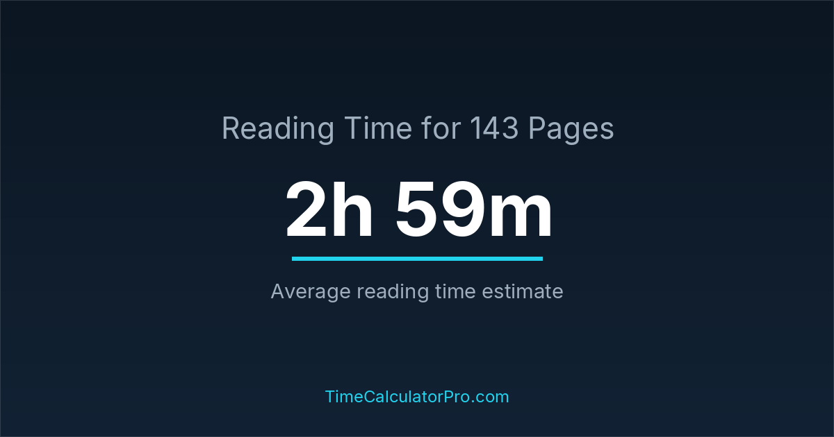 If you read at an average speed of 200 words per minute, reading 143 pages will take approximately 2 hours and 59 minutes. This estimate assumes around 250 words per page, which is typical for most books.