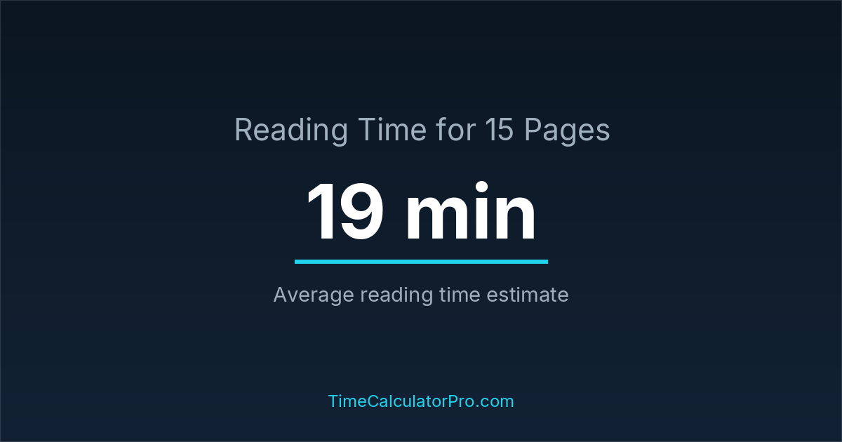 If you read at an average speed of 200 words per minute, reading 15 pages will take approximately 0 hours and 19 minutes. This estimate assumes around 250 words per page, which is typical for most books.