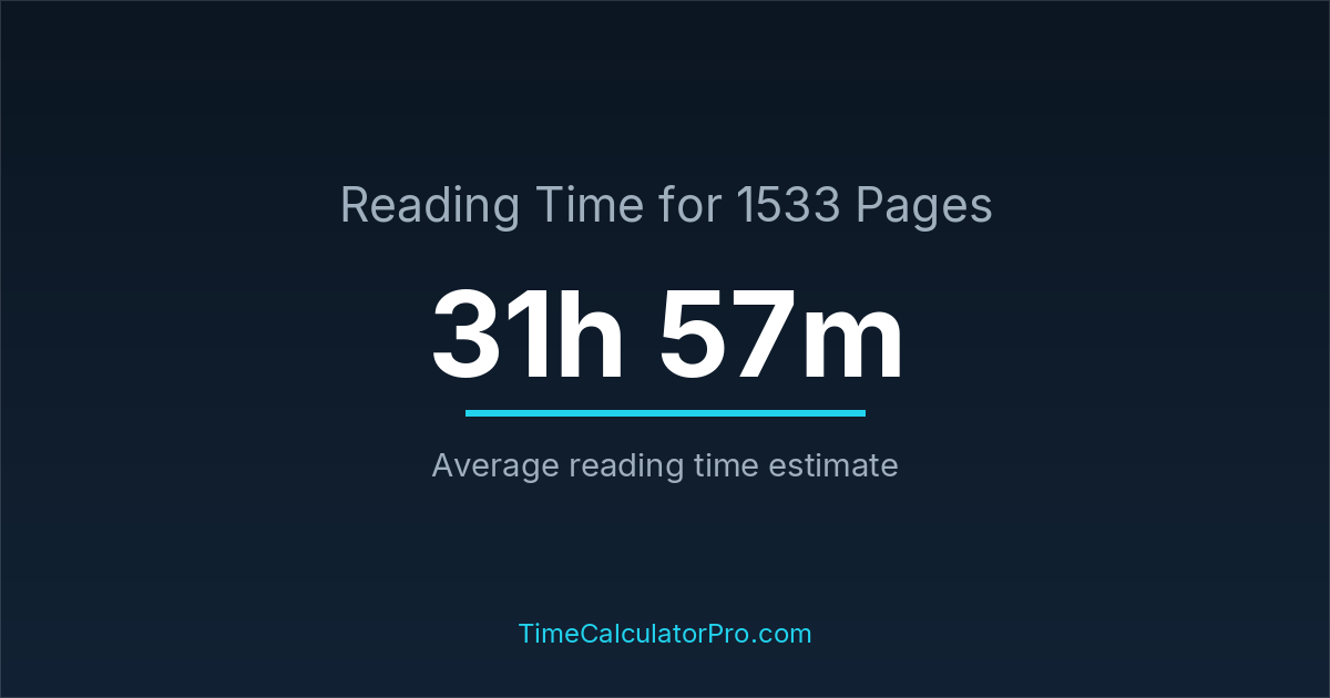 If you read at an average speed of 200 words per minute, reading 1533 pages will take approximately 31 hours and 57 minutes. This estimate assumes around 250 words per page, which is typical for most books.