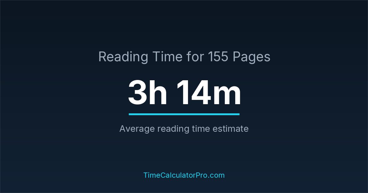 If you read at an average speed of 200 words per minute, reading 155 pages will take approximately 3 hours and 14 minutes. This estimate assumes around 250 words per page, which is typical for most books.