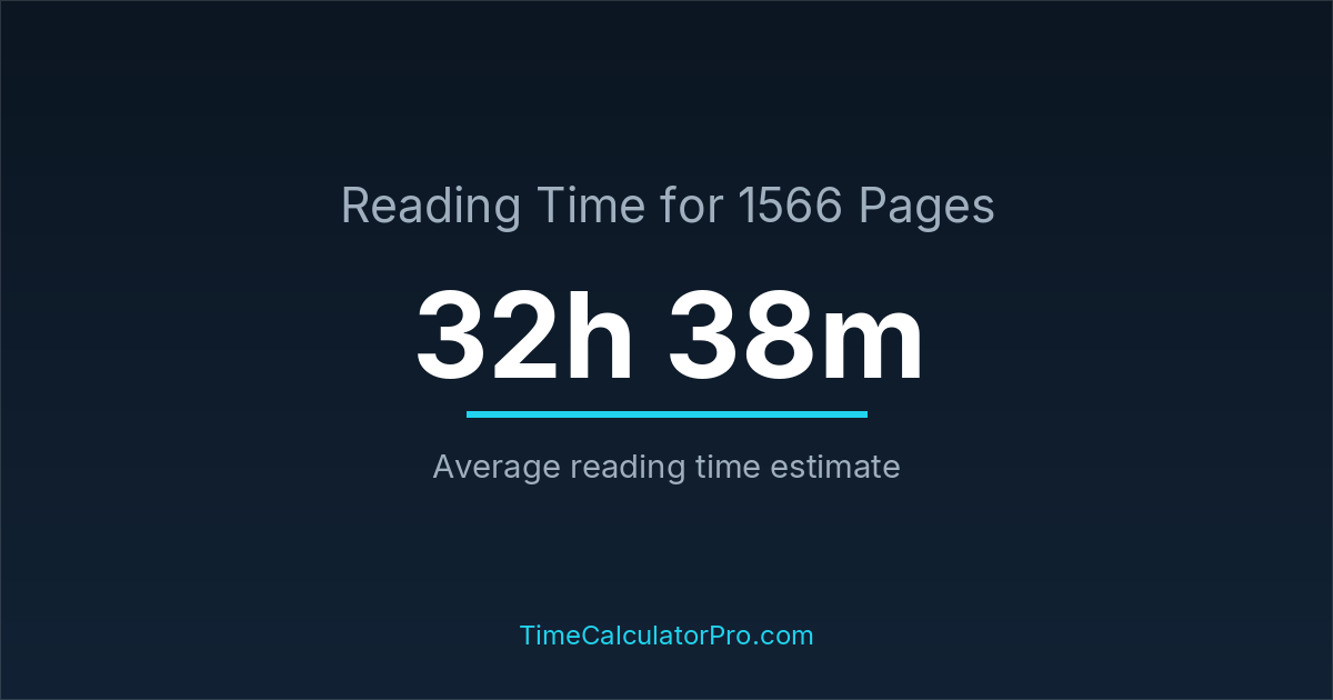If you read at an average speed of 200 words per minute, reading 1566 pages will take approximately 32 hours and 38 minutes. This estimate assumes around 250 words per page, which is typical for most books.