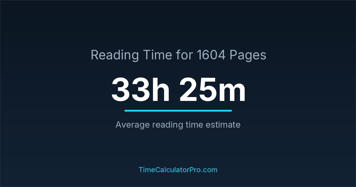 The estimated time to read 1604 pages is approximately 33 hours and 25 minutes for an average adult reader.