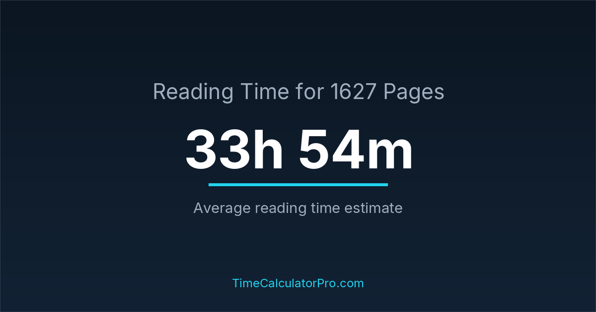 If you read at an average speed of 200 words per minute, reading 1627 pages will take approximately 33 hours and 54 minutes. This estimate assumes around 250 words per page, which is typical for most books.