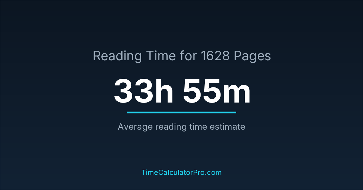 If you read at an average speed of 200 words per minute, reading 1628 pages will take approximately 33 hours and 55 minutes. This estimate assumes around 250 words per page, which is typical for most books.
