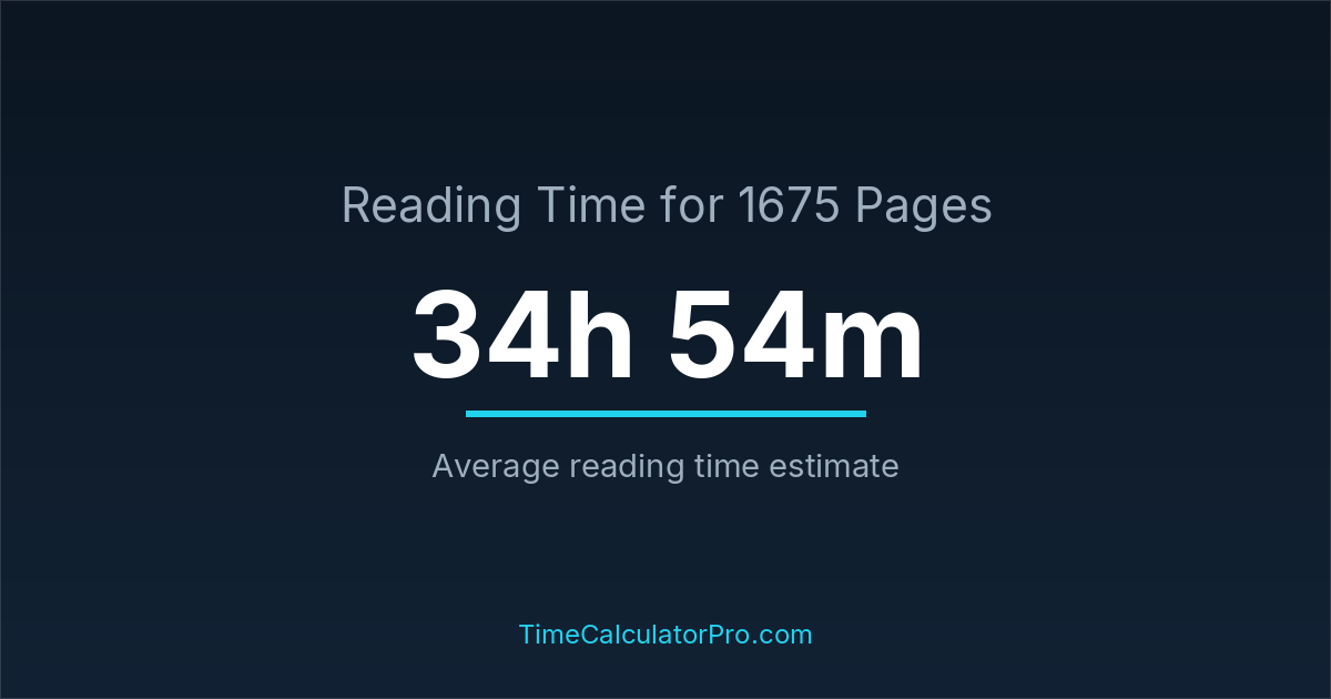 If you read at an average speed of 200 words per minute, reading 1675 pages will take approximately 34 hours and 54 minutes. This estimate assumes around 250 words per page, which is typical for most books.