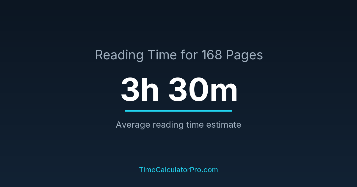 If you read at an average speed of 200 words per minute, reading 168 pages will take approximately 3 hours and 30 minutes. This estimate assumes around 250 words per page, which is typical for most books.