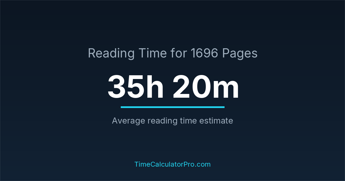 If you read at an average speed of 200 words per minute, reading 1696 pages will take approximately 35 hours and 20 minutes. This estimate assumes around 250 words per page, which is typical for most books.