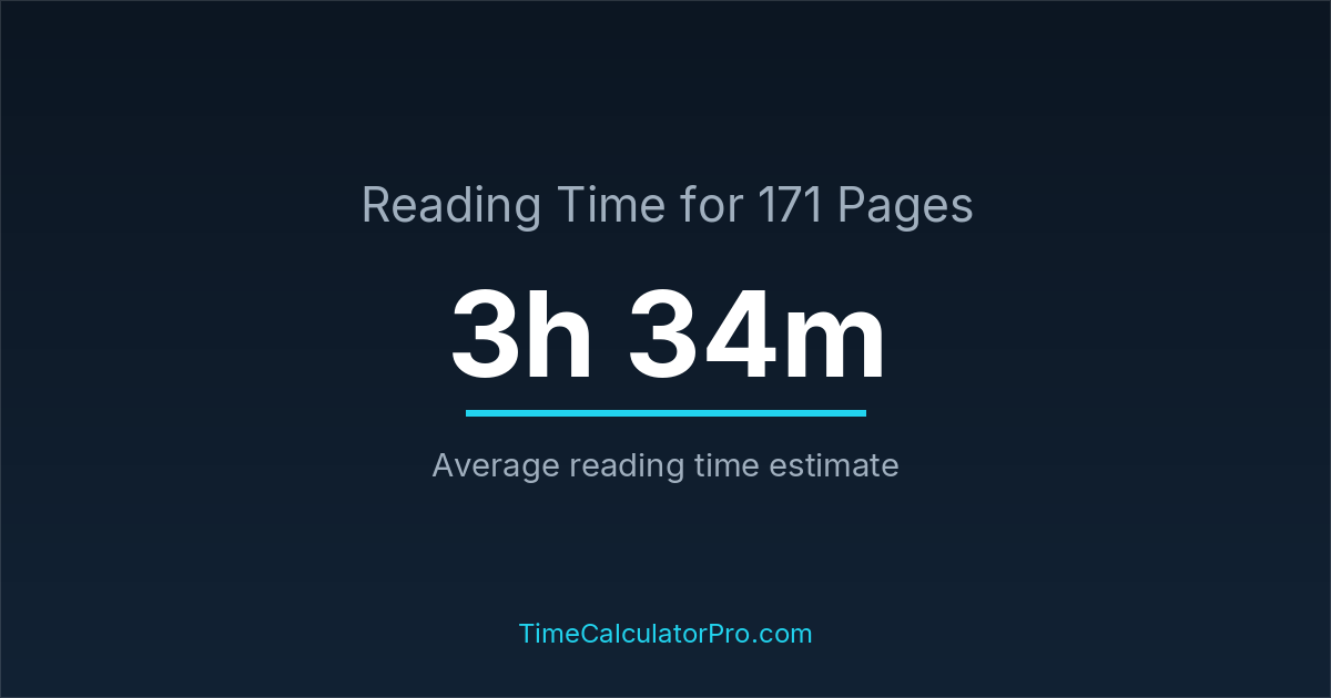 If you read at an average speed of 200 words per minute, reading 171 pages will take approximately 3 hours and 34 minutes. This estimate assumes around 250 words per page, which is typical for most books.