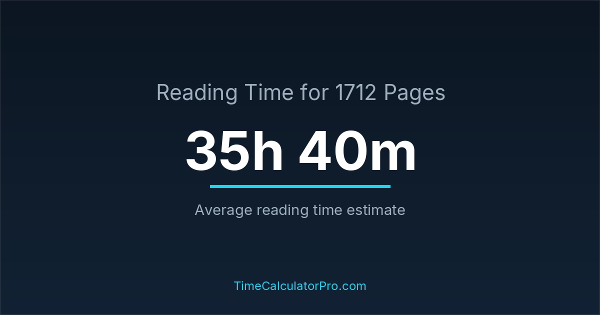 If you read at an average speed of 200 words per minute, reading 1712 pages will take approximately 35 hours and 40 minutes. This estimate assumes around 250 words per page, which is typical for most books.