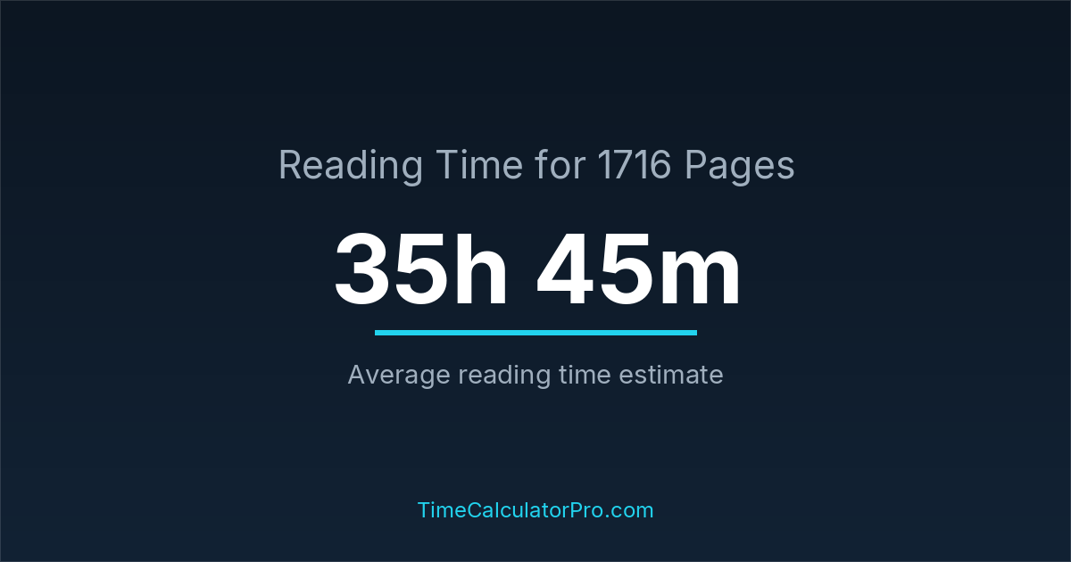 If you read at an average speed of 200 words per minute, reading 1716 pages will take approximately 35 hours and 45 minutes. This estimate assumes around 250 words per page, which is typical for most books.