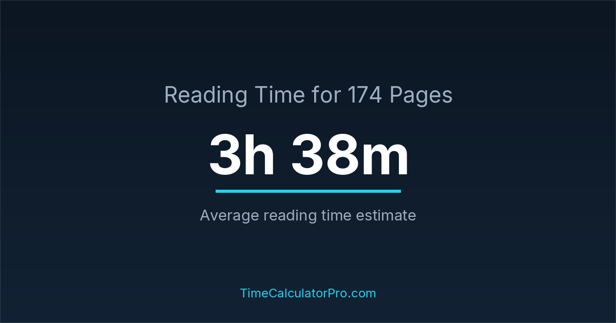 The estimated time to read 174 pages is approximately 3 hours and 38 minutes for an average adult reader.