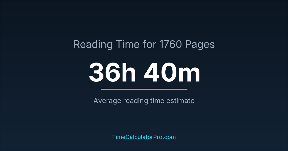 If you read at an average speed of 200 words per minute, reading 1760 pages will take approximately 36 hours and 40 minutes. This estimate assumes around 250 words per page, which is typical for most books.