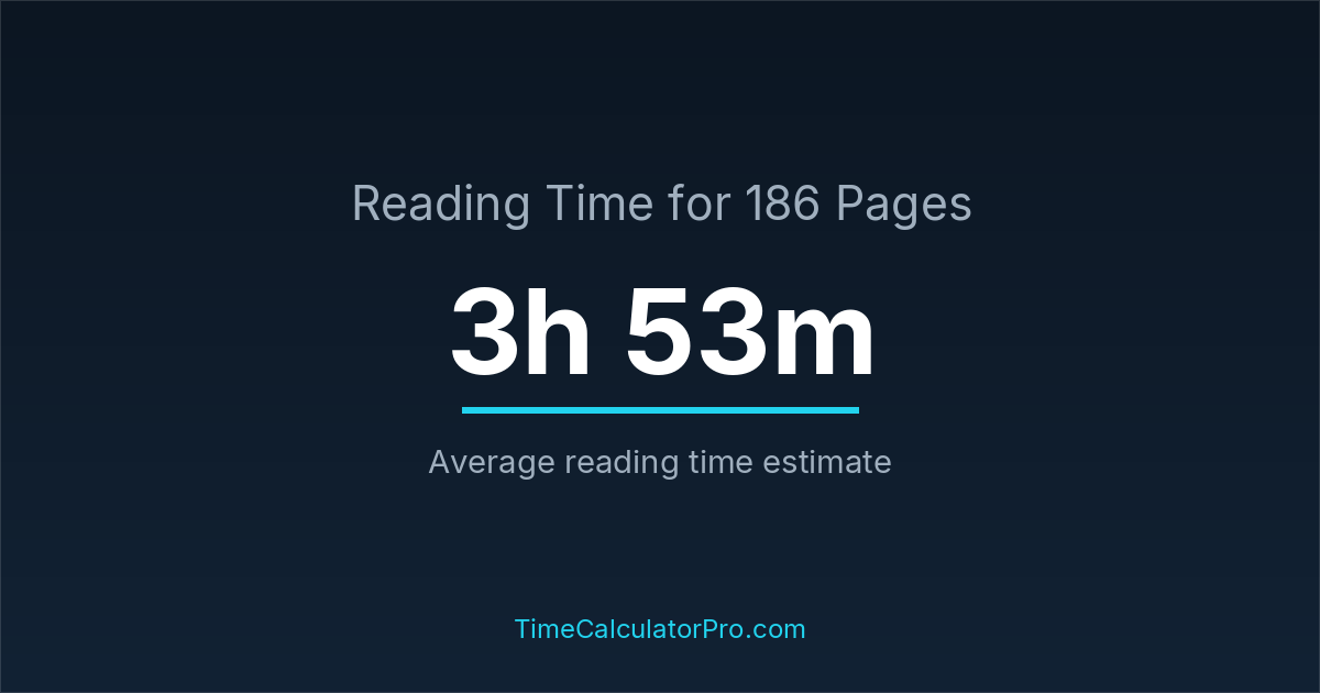 If you read at an average speed of 200 words per minute, reading 186 pages will take approximately 3 hours and 53 minutes. This estimate assumes around 250 words per page, which is typical for most books.