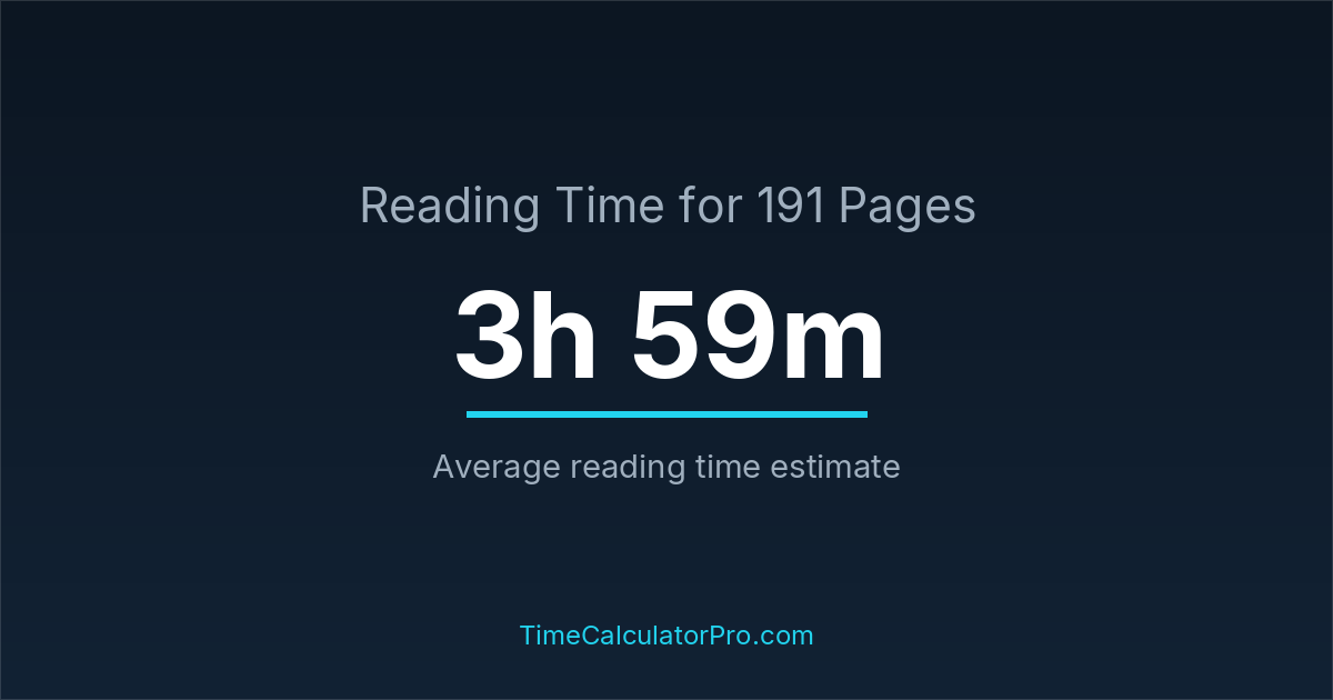 If you read at an average speed of 200 words per minute, reading 191 pages will take approximately 3 hours and 59 minutes. This estimate assumes around 250 words per page, which is typical for most books.