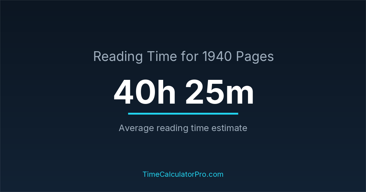 If you read at an average speed of 200 words per minute, reading 1940 pages will take approximately 40 hours and 25 minutes. This estimate assumes around 250 words per page, which is typical for most books.
