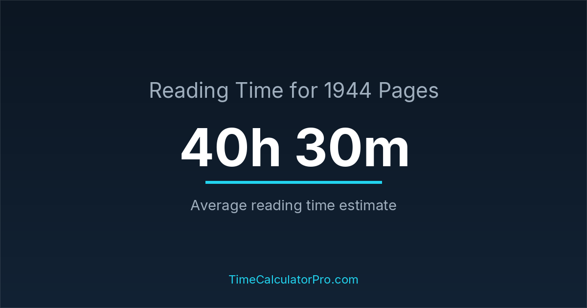 If you read at an average speed of 200 words per minute, reading 1944 pages will take approximately 40 hours and 30 minutes. This estimate assumes around 250 words per page, which is typical for most books.