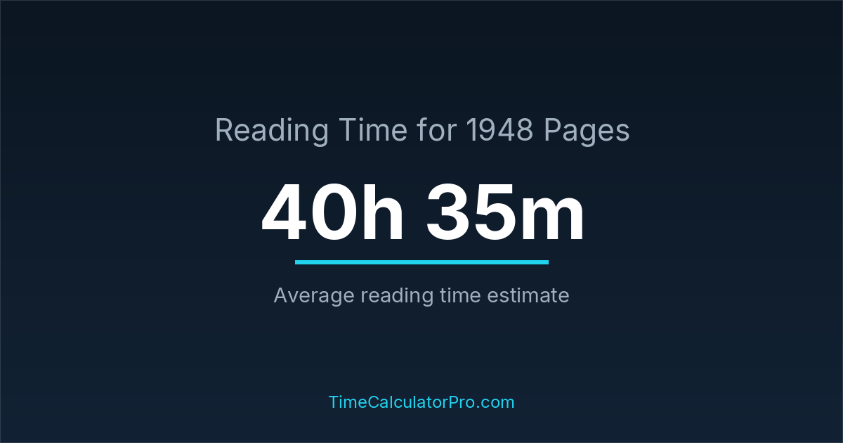If you read at an average speed of 200 words per minute, reading 1948 pages will take approximately 40 hours and 35 minutes. This estimate assumes around 250 words per page, which is typical for most books.