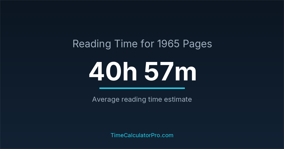 If you read at an average speed of 200 words per minute, reading 1965 pages will take approximately 40 hours and 57 minutes. This estimate assumes around 250 words per page, which is typical for most books.