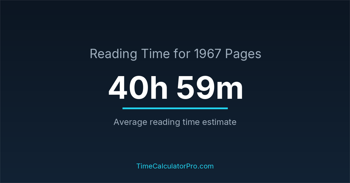 If you read at an average speed of 200 words per minute, reading 1967 pages will take approximately 40 hours and 59 minutes. This estimate assumes around 250 words per page, which is typical for most books.