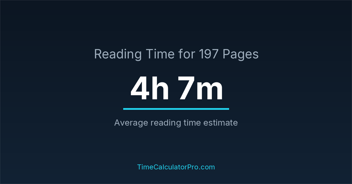 If you read at an average speed of 200 words per minute, reading 197 pages will take approximately 4 hours and 7 minutes. This estimate assumes around 250 words per page, which is typical for most books.