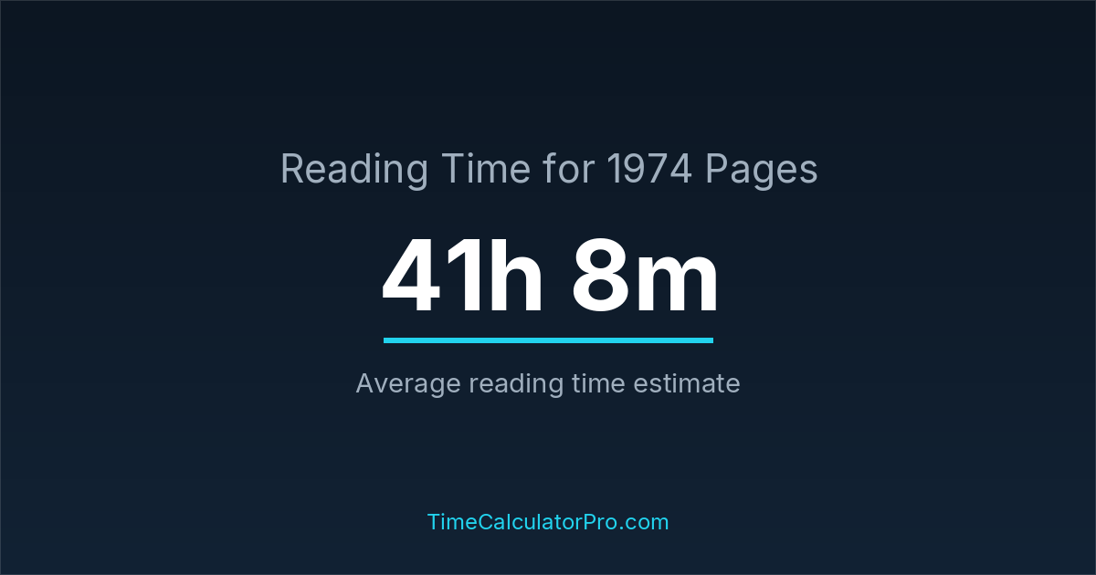 If you read at an average speed of 200 words per minute, reading 1974 pages will take approximately 41 hours and 8 minutes. This estimate assumes around 250 words per page, which is typical for most books.