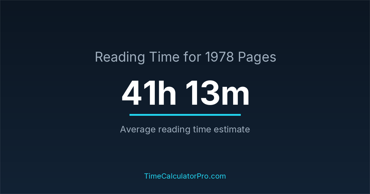 If you read at an average speed of 200 words per minute, reading 1978 pages will take approximately 41 hours and 13 minutes. This estimate assumes around 250 words per page, which is typical for most books.