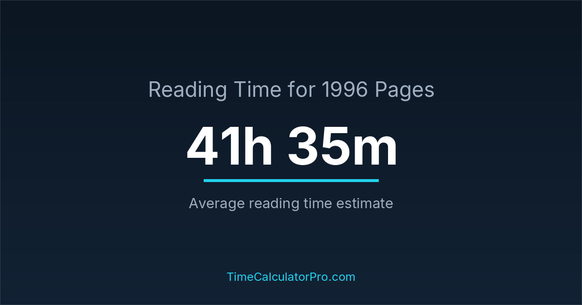If you read at an average speed of 200 words per minute, reading 1996 pages will take approximately 41 hours and 35 minutes. This estimate assumes around 250 words per page, which is typical for most books.