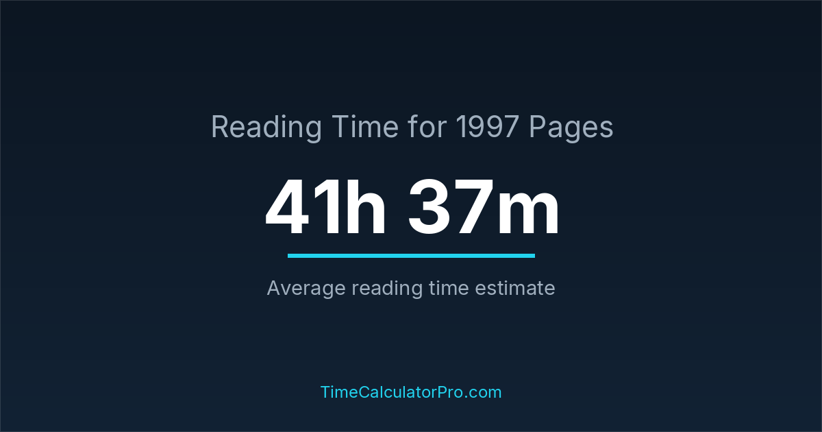 If you read at an average speed of 200 words per minute, reading 1997 pages will take approximately 41 hours and 37 minutes. This estimate assumes around 250 words per page, which is typical for most books.