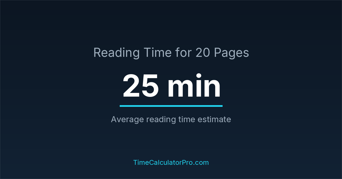 If you read at an average speed of 200 words per minute, reading 20 pages will take approximately 0 hours and 25 minutes. This estimate assumes around 250 words per page, which is typical for most books.