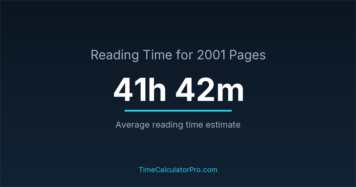 If you read at an average speed of 200 words per minute, reading 2001 pages will take approximately 41 hours and 42 minutes. This estimate assumes around 250 words per page, which is typical for most books.