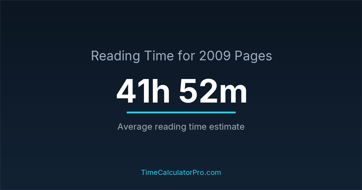 If you read at an average speed of 200 words per minute, reading 2009 pages will take approximately 41 hours and 52 minutes. This estimate assumes around 250 words per page, which is typical for most books.